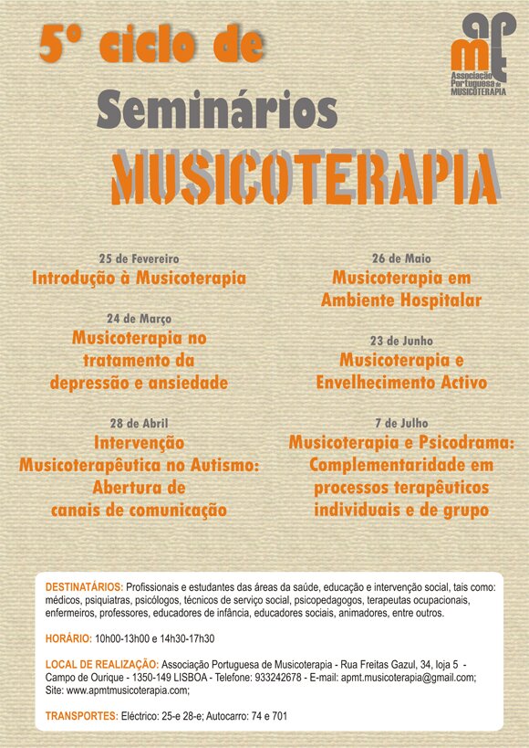 A Associação Portuguesa de Musicoterapia vai promover o 5º Ciclo de Seminários de Musicoterapia, que terá ínicio dia 25 de Fevereiro. Este Ciclo incluirá seis seminários teórico-práticos, tendo como objectivo sensibilizar e informar a comunidade profissional, e o público em geral, sobre as aplicações clínicas da Musicoterapia em diversos contextos institucionais de saúde e intervenção psicossocial em Portugal.